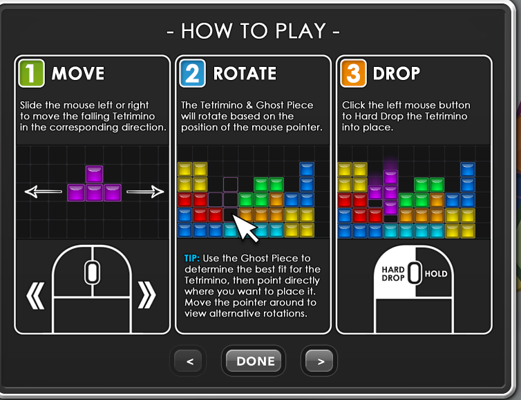 참고로 게임을 조작하는 키는 마우스와 키보드 둘 다 지원을 하고 있습니다. 이 부분이 장점이라서 여러분들께 추천드리는 부분입니다. 마우스로는 왼쪽 버튼은 빠르게 내리기, 오른쪽은 홀드 버튼입니다. 블록 이동은 마우스를 움직여주시면 됩니다. 키보드는 z가 모양 바꾸기, c가 홀드입니다. 스페이스 바는 빠르게 내리기입니다. 그 외 기본적인 블록 이동은 방향키 키보드로 움직여주시면 되겠습니다.