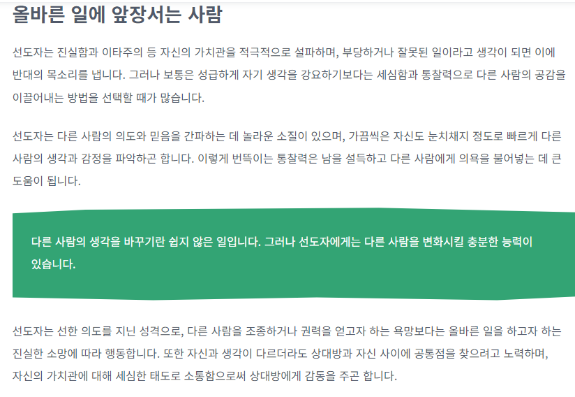 이타주의적인 성격이 강하다 보니 부당하거나 잘못된 일을 가만히 보질 못하고 그냥 넘어가질 못합니다. 또한 다른 사람들의 행동을 변화시키고 동기부여 하는 데 월등한 능력을 보입니다.