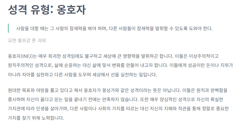 이번에는 옹호자형의 INFJ의 성격 유형을 알아보겠습니다. 해당 사이트에서 검사를 하시면 위와 같은 자료들을 확인하실 수가 있습니다. 아주 자세하고 상세하게 기재되어 있기 때문에 이해하는 데 도움이 되실 겁니다. 옹호자은 매우 희귀한 성격이라고 합니다. 또한 이상주의적이고 원칙주의적인 성격이 강하다고 합니다. 이런 성격으로 이해서 다른 사람들의 불의를 참지 못하는 느낌이 강합니다.